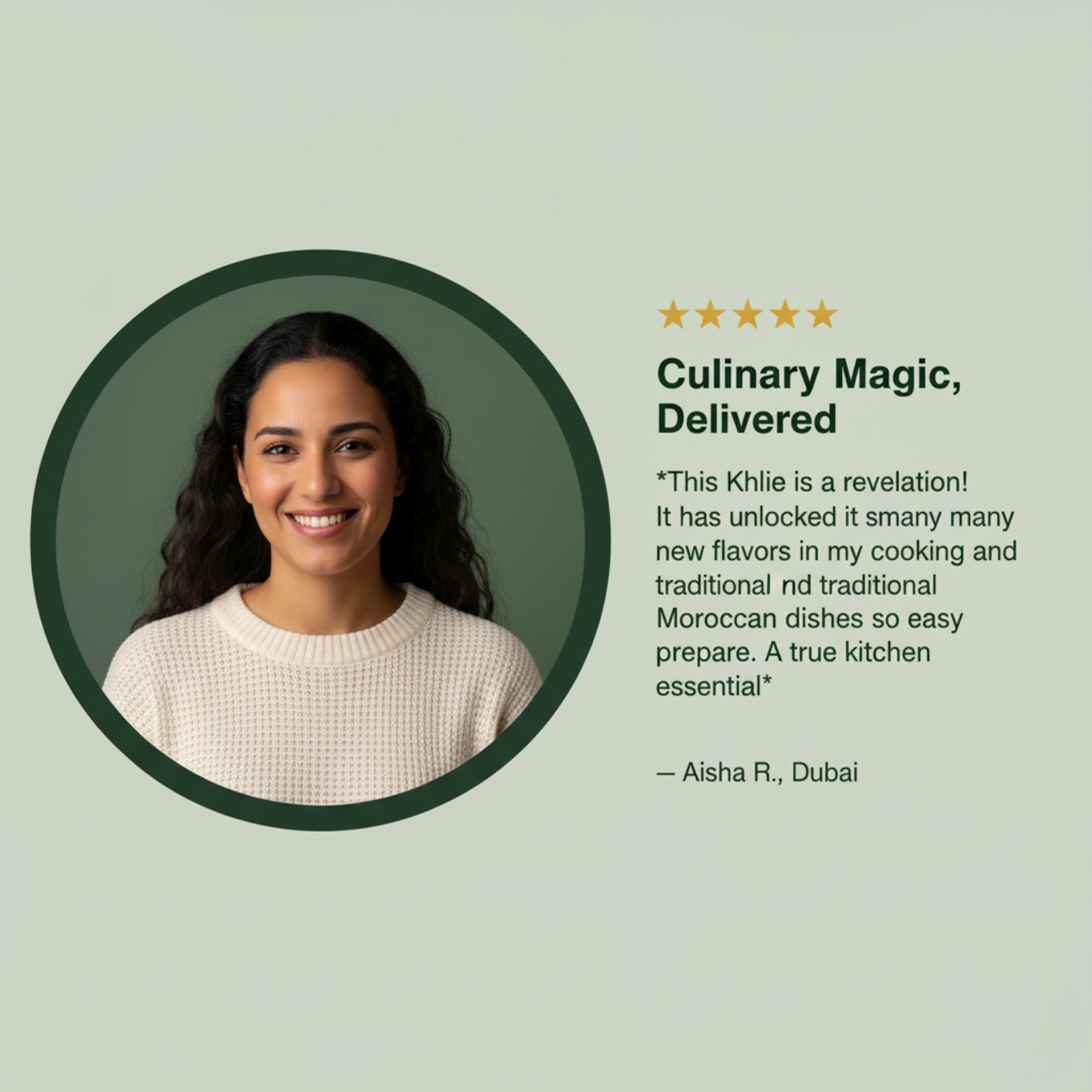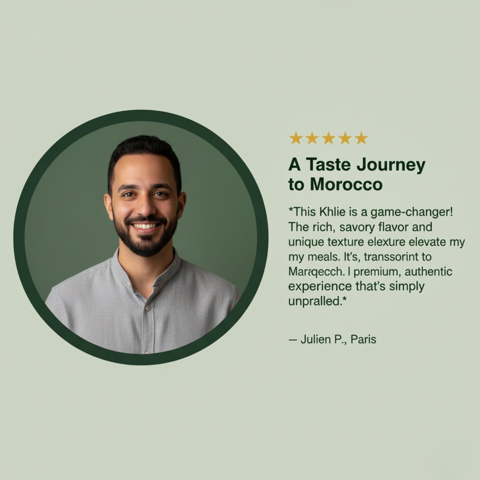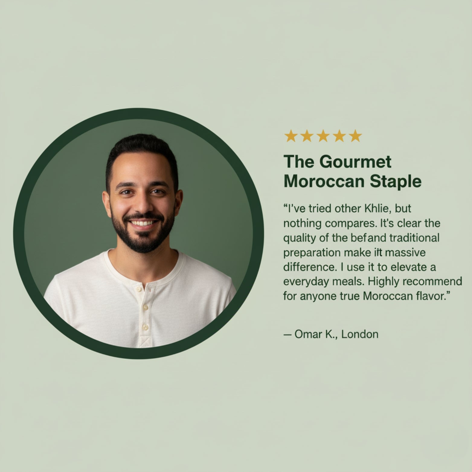 We designed this recipe specifically to ensure the authenticity of the flavor is preserved. The deep, complex taste comes primarily from the hours of slow-cooking and the carefully balanced blend of traditional Moroccan spices. The olive oil acts as the preserving agent and a gentle carrier of flavor, allowing the rich taste of the Khlie to remain front and center. Our customers agree it delivers the true, uncompromised taste of lkhli3.